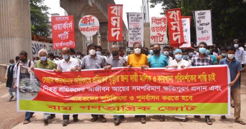 নারায়ণগঞ্জের রূপগঞ্জে সেজান জুস কারখানায় আগুনে পুড়ে সরকারি হিসেবে ৫২ জন শ্রমিক নিহত হওয়াকে রাষ্ট্রীয় কাঠামোগত হত্যাকাণ্ডের দায়ে কারখানা মালিকও কারখানা পদির্শককে গ্রেপ্তার ও বিচার এবং নিহত শ্রমিকের আজীবন আয়ের সমান ক্ষতিপূরণ প্রদান, আহতদের সুচিকিৎসা ও পুনর্বাসনের দাবিতে বাম গণতান্ত্রিক জোট এর উদ্যোগে আজ ১০ জুলাই ২০২১ সকাল ১১টায় জাতীয় প্রেসক্লাবের সামনে সমাবেশ ও বিক্ষোভ অনুষ্ঠিত হয়।