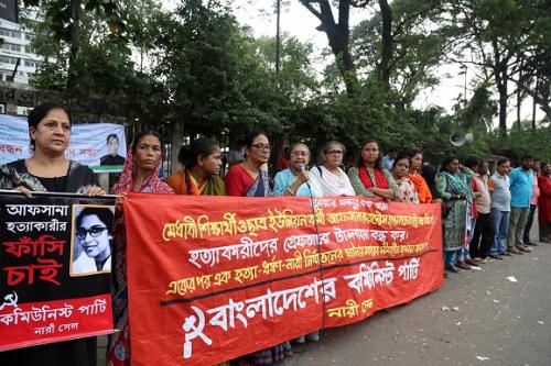 বাংলাদেশের কমিউনিস্ট পার্টি নারী সেল-এর উদ্যোগে আজ ২০ আগস্ট, শনিবার জাতীয় প্রেসক্লাবের সামনে মেধাবী শিক্ষার্থী ও ছাত্র ইউনিয়ন কর্মী আফসানা হত্যাকাণ্ডের বিচারের দাবিতে মানববন্ধন ও সমাবেশ অনুষ্ঠিত হয়। বাংলাদেশের কমিউনিস্ট পার্টির অন্যতম প্রেসিডিয়াম সদস্য কমরেড লক্ষ্মী চক্রবর্তীর সভাপতিত্বে সমাবেশে বক্তব্য রাখেন সিপিবি কেন্দ্রীয় কমিটির সদস্য মাকসুদা আক্তার লাইলী, শ্রমিকনেতা কমরেড জলি তালুকদার, সিপিবি নারী শাখার সম্পাদক কমরেড তাহমিনা ইয়াসমিন নীলা, বাংলাদেশ উদীচী শিল্পী গোষ্ঠীর সহ-সাধারণ সম্পাদক সংগীতা ইমাম, ছাত্র ইউনিয়ন সভাপতি লাকী আক্তার ও ছাত্র নেতা নিলয় অনন্যা পাটোয়ারি। সমাবেশটি পরিচালনা করেন নারীনেত্রী কমরেড লুনা নূর।