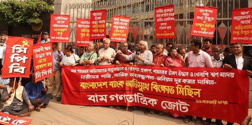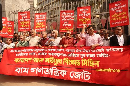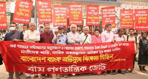 বাংলাদেশ ব্যাংকের সামনে অনুষ্ঠিত বিক্ষোভ সমাবেশে বাম গণতান্ত্রিক জোটের নেতৃবৃন্দ অবিলম্বে কোটি টাকার ঊর্ধ্বে ঋণ খেলাপিদের তালিকা ও কিভাবে সংশ্লিষ্ট ঋণ পেয়েছিল তার তথ্য প্রকাশ এবং অর্থ পাচারের অনুসন্ধান ও শ্বেতপত্র প্রকাশের দাবি জানিয়েছেন।