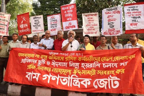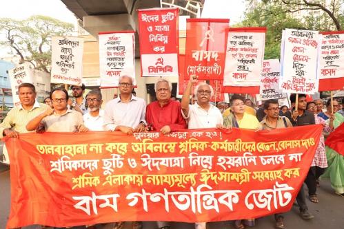 বাম গণতান্ত্রিক জোট আয়োজিত সমাবেশে নেতৃবৃন্দ অবিলম্বে দেশের সকল শ্রমিক কর্মচারীদের বেতন ও বোনাস প্রদান, ঈদের ছুটি যথাযথভাবে নিশ্চিত করা এবং শ্রমিক-কর্মচারী এলাকায় ঈদ সামগ্রী ন্যায্যমূল্যে প্রদানের দাবি জানিয়েছেন।