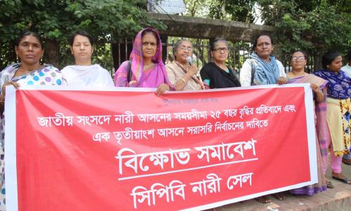 জাতীয় সংসদে সংরক্ষিত নারী আসনের বর্তমান প্রক্রিয়া ২৫ বছর বহাল রাখার সিদ্ধান্তের প্রতিবাদে বাংলাদেশের কমিউনিস্ট পার্টি (সিপিবি) নারী সেলের উদ্যেগে আজ ২০ জুলাই জাতীয় প্রেসক্লাবের সামনে বিক্ষোভ সমাবেশ অনুষ্ঠিত হয়।