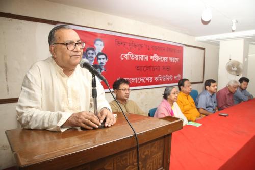 বেতিয়ারা শহীদ দিবস উপলক্ষে পল্টনস্থ মুক্তিভবনের মৈত্রী মিলনায়তনে এক আলোচনা সভায় বক্তব্য রাখছেন সিপিবি’র সভাপতি মুজাহিদুল ইসলাম সেলিম [উৎসঃ রতন দাস]আজ ১১ নভেম্বর। ১৯৭১ সালের ১১ নভেম্বর কুমিল্লা জেলার চৌদ্দগ্রাম উপজেলার বেতিয়ারাতে পাকিস্তানী বাহিনীর সাথে সম্মুখ সমরে অসীম সাহসিকতার সাথে যুদ্ধ করে জীবন উৎসর্গ করেন ন্যাপ-কমিউনিস্ট পার্টি-ছাত্র ইউনিয়নের বিশেষ গেরিলা বাহিনীর ৯ জন গেরিলা যোদ্ধা। বেতিয়ারার এই যুদ্ধে যাঁরা শহীদ হন, তাঁরা হচ্ছেন- নিজাম উদ্দিন আজাদ, সিরাজুম মুনীর, মো. শহীদুল্লাহ, বশির মাস্টার, আব্দুল কাইয়ুম, জহিরুল হক দুদু, আওলাদ হোসেন, কাদের মিয়া, সফিউল্লাহ।