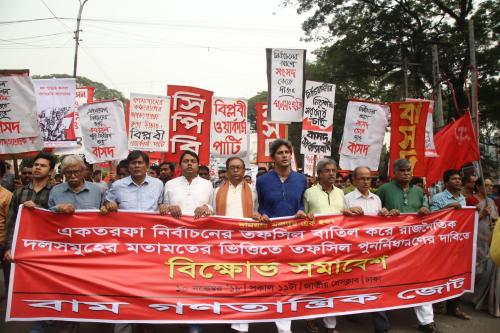 সমাবেশ শেষে বাম গণতান্ত্রিক জোটের বিক্ষোভ মিছিল আন্দোলন করছে। তফসিল ঘোষণার আগে সংসদ ভেঙে দেয়া, দল-নিরপেক্ষ নির্বাচনকালীন তদারকি সরকার গঠন, নির্বাচনের কমিশনের পুনর্গঠন, কালো টাকা-পেশীশক্তি-সাম্প্রদায়িকতা-প্রশাসনিক কারসাজিমুক্ত নির্বাচনের পরিবেশ তৈরির জন্য বাম জোট সরকার ও নির্বাচন কমিশনের কাছে বারবার দাবি জানিয়ে আসছে। প্রধানমন্ত্রীর সঙ্গে সংলাপে বাম জোট নেতারা অবাধ-নিরপেক্ষ-অংশগ্রহণমূলক-গ্রহণযোগ্য নির্বাচনের জন্য সুনির্দিষ্ট ৮টি দাবি, নির্বাচনী ব্যবস্থার গণতান্ত্রিক সংস্কারের জন্য ৭টি প্রস্তাবনা দিয়েছিলেন। প্রধানমন্ত্রী সংলাপ বিষয়ে প্রকাশ্যে তাঁর বক্তব্য দেয়ার কথা বলেছিলেন।