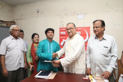 বাংলাদেশের কমিউনিস্ট পার্টির সভাপতি মুজাহিদুল ইসলাম সেলিমের হাত থেকে গাজীপুর-৪ আসনের মনোনয়নপত্র নিচ্ছেন বাংলাদেশ ছাত্র ইউনিয়নের সাবেক সভাপতি মানবেন্দ্র দেব ছাত্র ইউনিয়নের সাবেক সভাপতি শরিফুজ্জামান শরিফ (বাগেরহাট-৪), বাংলাদেশ ছাত্র ইউনিয়নের সাবেক সভাপতি মানবেন্দ্র দেব (গাজীপুর-৪), বিশিষ্ট সমাজসেবক ও শিশু-কিশোর সংগঠক আবু তাহের বকুল (ঢাকা-৬), ক্ষেতমজুর আন্দোলনের অন্যতম সংগঠক অধ্যাপক কামরুজ্জামান (রংপুর-৬), কুড়িগ্রাম জেলা সিপিবি’র সভাপতি উপেন্দ্রনাথ রায় (কুড়িগ্রাম-২), গাইবান্ধা জেলা সিপিবি’র নেতা আদিবাসীদের অধিকারের আন্দোলনের অন্যতম সংগঠক যজ্ঞেশ্বর বর্মন (গাইবান্ধা-৫), বগুড়া সিপিবি’র নেতা ও কৃষক আন্দোলনের সংগঠক সন্তোষ পাল (বগুড়া-৫), ঝিনাইদহ সিপিবি’র নেতা আব্দুর রব (ঝিনাইদহ-৩), ক্ষেতমজুর আন্দোলনের অন্যতম সংগঠক অ্যাডভোকেট চিত্তরঞ্জন গোলদার (খুলনা-৫), সিপিবি ময়মনসিংহ জেলার নেতা, হারুন আল বারী (ময়মনসিংহ-৩), নওগাঁ