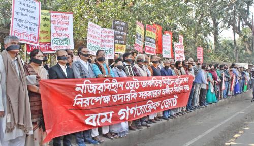নজিরবিহীন ভোট ডাকাতির নির্বাচন বাতিল ও নিরপেক্ষ তদারকি সরকারের অধীনে নির্বাচনের দাবিতে জাতীয় প্রেসক্লাবের সামনে বাম গণতান্ত্রিক জোটের উদ্যোগে নেতাকর্মীরা মুখে কালো কাপড় বেঁধে মানববন্ধন ও অবস্থান তা পুরোপুরি নষ্ট করে দেওয়া হয়েছে। দলীয় সরকারের অধীনে বাংলাদেশে ন্যূনতম গণতান্ত্রিক পরিবেশে অবাধ, নিরপেক্ষ, গ্রহণযোগ্য নির্বাচনের যেকোন অবকাশ নেই তা আরেকবার প্রমাণ হল। তাই এই নির্বাচন ফলাফল গ্রহণযোগ্য হবে না। এই নির্বাচনে জনগণের মতামতের কোনো প্রতিফলন ঘটেনি।