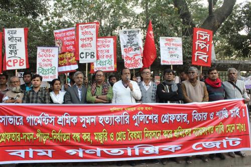গার্মেন্ট শ্রমিক সুমন হত্যার প্রতিবাদে ও গার্মেন্ট শ্রমিকদের বাঁচার মত ন্যায্য মজুরি বৃদ্ধিতে আজ ১০ জানুয়ারি বিকালে জাতীয় প্রেসক্লাবের সম্মুখে বাম গণতান্ত্রিক জোট আয়োজিত বিক্ষোভ সমাবেশে নেতৃবৃন্দ বলেছেন, হত্যা নির্যাতন করে শ্রমিকদের বাঁচার আন্দোলন নস্যাৎ করা যাবে না; শ্রমিকদের বুকে গুলি চালিয়ে সরকার ও মালিকপক্ষ শেষ রক্ষা করতে পারবে না।