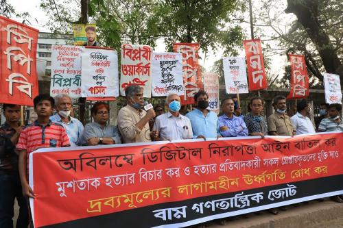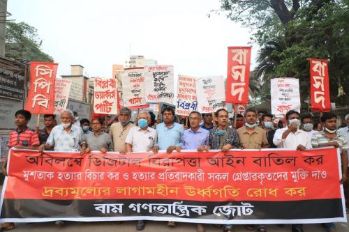 ডিজিটাল নিরাপত্তা আইন বাতিল, লেখক মুুশতাক আহমেদ হত্যার বিচার, মুশতাক হত্যাকাণ্ডের প্রতিবাদকারী সকল গ্রেফতারকৃতদের মুক্তি, মিথ্যা মামলা প্রত্যাহার ও দ্রব্যমূল্যের লাগামহীন ঊধর্গতি রোধের দাবিতে আজ ৯ মার্চ, ২০২১ দেশব্যাপী বিক্ষোভের কেন্দ্রীয় কর্মসূচিতে জাতীয় প্রেসক্লাবের সামনে বাম গণতান্ত্রিক জোটের কেন্দ্রীয় পরিচালনা পরিষদের সমন্বয়ক সিপিবি’র প্রেসিডিয়াম সদস্য আবদুল্লাহ ক্বাফী রতনের সভাপতিত্বে সমাবেশ বক্তব্য রাখেন, কমিউনিস্ট পার্টির সহকারী সাধারণ সম্পাদক সাজ্জাদ জহির চন্দন, বাসদ (মার্কসবাদী)’র আ ক ম জহিরুল ইসলাম, বাসদ কেন্দ্রীয় নেতা খালেকুজ্জামান লিপন, বিপ্লবী ওয়ার্কার্স পার্টির পলিটব্যুরোর সদস্য আকবর খান, ইউসিএলবি’র কেন্দ্রীয় নেতা নজরুল ইসলাম, গণতান্ত্রিক বিপ্লবী পার্টির শহীদলু ইসলাম সবুজ, গণসংহতি আন্দোলনের সম্পাকমন্ডলীর সদস্য বাচ্চু ভূইয়া, সমাজতান্ত্রিক আন্দোলনের সভাপতি হামিদুল হক।