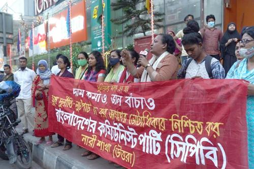 দাম কমাও, জান বাঁচাও দাবিতে সিপিবি বিক্ষোভ সপ্তাহের ৫ম দিনে সিপিবি নারী শাখা (উত্তর) এর উদ্যোগে রাজধানীর মোহাম্মদপুরের টোকিও স্কয়ারের সামনে বিক্ষোভ সমাবেশ অনুষ্ঠিত হয়েছে। নারী শাখার সম্পাদক কমরেড রত্না সরকারের সভাপতিত্বে সভাপতিত্বে ও কমরেড লাকী আক্তারের সঞ্চালনায় সমাবেশে বক্তব্য রাখে সিপিবি’র কেন্দ্রীয় নেতা কমরেড অধ্যাপক কাবেরী গায়েন, ঢাকা উত্তর কমিটির সাধারণ সম্পাদক কমরেড লূনা নূর, কমরেড লাভলী হক। এছাড়াও উপস্থিত ছিলেন বাংলাদেশের কমিউনিস্ট পার্টি ঢাকা মহানগর উত্তরের সভাপতি ডা. সাজেদুল হক রুবেল, কমরেড মোসলেহ উদ্দিন, কমরেড মোতালেব হোসেন, কমরেড জাহিদুল ইসলাম সজীব সহ অন্যন্য নেতৃবৃন্দ।