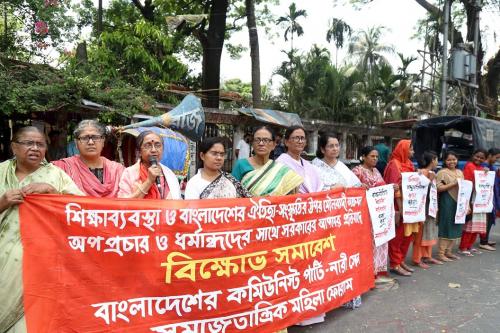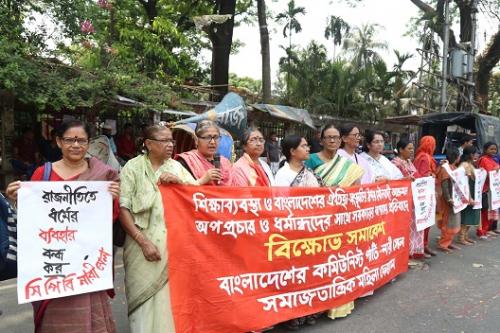 শিক্ষাব্যবস্থা ও বাংলাদেশের ঐতিহ্য-সংস্কৃতির উপর মৌলবাদী আক্রমণ, অপপ্রচার ও ধর্মান্ধদের সাথে সরকারের আপসের প্রতিবাদে আজ ১৫ এপ্রিল ২০১৭, শনিবার, সকাল ১১টায়, জাতীয় প্রেসক্লাবের সামনে বাংলাদেশের কমিউনিস্ট পার্টি নারী সেল ও সমাজতান্ত্রিক মহিলা ফোরামের উদ্যোগে বিক্ষোভ সমাবেশ হয়।