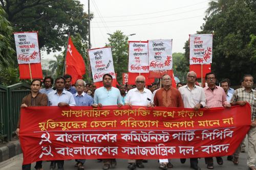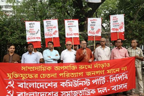 বাংলাদেশের কমিউনিস্ট পার্টি (সিপিবি) ও বাংলাদেশের সমাজতান্ত্রিক দল-বাসদ আহূত দেশব্যাপী সাম্প্রদায়িকতা বিরোধী বিক্ষোভ কর্মসূচিতে কেন্দ্রীয়ভাবে আয়োজিত বিক্ষোভ-সমাবেশে সিপিবি’র সভাপতি কমরেড মুজাহিদুল ইসলাম সেলিম বলেছেন, উগ্র সাম্প্রদায়িক শক্তি বিষাক্ত ফনা তুলেছে। তারা একে একে আমাদের মুক্তিযুদ্ধের সকল অর্জন মুছে ফেলতে চাইছে। আর মুক্তিযুদ্ধের কথা বলে সরকার সাম্প্রদায়িক গোষ্ঠীর পৃষ্ঠপোষকের ভূমিকায় অবতীর্ণ হয়েছে। শাসকশ্রেণির বড় দুই দল জামায়াত আর হেফাজতকে নিজেদের মধ্যে ভাগ করে নিয়েছে। সাম্প্রদায়িকতা প্রতিরোধে ’৭১-এর মতো ঘরে ঘরে দুর্গ গড়ে তুলতে হবে। গণপ্রতিরোধ গড়ে তুলতে হবে।