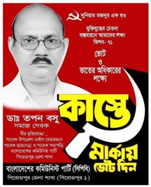 পিরোজপুর-১ আসনে বাংলাদেশের কমিউনিস্ট পার্টি (সিপিবি) মনোনীত বাম গণতান্ত্রিক জোটের কাস্তে মার্কার প্রার্থী, সিপিবি পিরোজপুর জেলা কমিটির সভাপতি ডা. তপন বসুর ওপর হামলা হয়েছে। আজ ১৭ ডিসেম্বর রাত আনুমানিক ৮ টার দিকে ডা. তপন বসু নিজ চেম্বারে রোগী দেখার সময় ৮-১০জনের একদল সন্ত্রাসী তাঁর ওপর হামলা চালায়। এলাকার জনপ্রিয় এ সিপিবি নেতা নির্বাচিত উপজেলা ভাইস চেয়ারম্যান ছিলেন। আসন্ন জাতীয় সংসদ নির্বাচনে তিনি পিরোজপুর-১ আসনে শক্তিশালী প্রার্থী হিসেবে মানুষের কাছে গ্রহণযোগ্য। আহত অবস্থায় ডা. তপন বসুকে স্থানীয় হাসপাতালে ভর্তি করা হয়েছে। প্রাথমিকভাবে জানা যায়, সরকারি দল আওয়ামী লীগের নাজিমুদ্দিন সোহেল, নয়নের নেতৃত্বে এ হামলা হয়। সন্ত্রাসীরা ডা. তপন বসুকে নির্বাচনী হুমকিও প্রদান করে।