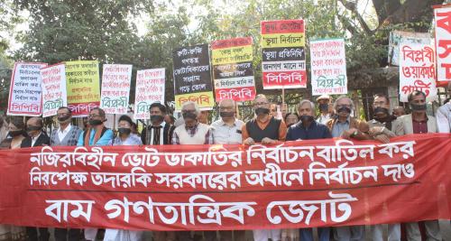 নজিরবিহীন ভোট ডাকাতির নির্বাচন বাতিল ও নিরপেক্ষ তদারকি সরকারের অধীনে নির্বাচনের দাবিতে জাতীয় প্রেসক্লাবের সামনে বাম গণতান্ত্রিক জোটের উদ্যোগে নেতাকর্মীরা মুখে কালো কাপড় বেঁধে মানববন্ধন ও অবস্থান তা পুরোপুরি নষ্ট করে দেওয়া হয়েছে। দলীয় সরকারের অধীনে বাংলাদেশে ন্যূনতম গণতান্ত্রিক পরিবেশে অবাধ, নিরপেক্ষ, গ্রহণযোগ্য নির্বাচনের যেকোন অবকাশ নেই তা আরেকবার প্রমাণ হল। তাই এই নির্বাচন ফলাফল গ্রহণযোগ্য হবে না। এই নির্বাচনে জনগণের মতামতের কোনো প্রতিফলন ঘটেনি।