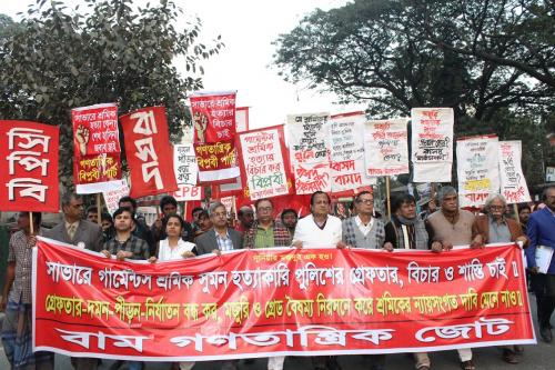 গার্মেন্ট শ্রমিক সুমন হত্যার প্রতিবাদে ও গার্মেন্ট শ্রমিকদের বাঁচার মত ন্যায্য মজুরি বৃদ্ধিতে আজ ১০ জানুয়ারি বিকালে জাতীয় প্রেসক্লাবের সম্মুখে বাম গণতান্ত্রিক জোট আয়োজিত বিক্ষোভ সমাবেশে নেতৃবৃন্দ বলেছেন, হত্যা নির্যাতন করে শ্রমিকদের বাঁচার আন্দোলন নস্যাৎ করা যাবে না; শ্রমিকদের বুকে গুলি চালিয়ে সরকার ও মালিকপক্ষ শেষ রক্ষা করতে পারবে না।