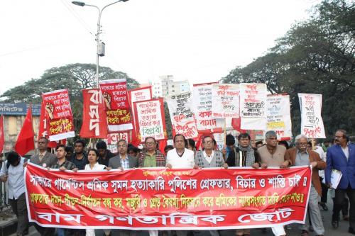অব্যাহত রেখেছে। কেবল প্রতিপক্ষের মার্কায় ভোট দেবার জন্য নারীকে ধর্ষিতা হতে হয়। জনগণকে পালিয়ে বেড়াতে হয়। নেতৃবৃন্দ গার্মেন্টস শ্রমিক সমুন মিয়ার হত্যাকারীদের গ্রেপ্তার ও বিচার, আহত গার্মেন্ট শ্রমিকদের উপযুক্ত চিকিৎসা এবং সর্বোপরি গার্মেন্টস শ্রমিকদের মজুরি নিয়ে যে প্রতারণা চলছে তা বন্ধ করে শ্রমিকদের মজুরি বৃদ্ধির দাবি জানান। নেতৃবৃন্দ কোন তালবাহানা না করে শ্রমিকদের বকেয়া মজুরি অনতিবিলম্বে পরিশোধের জন্যেও মালিকদের প্রতি আহ্বান জানান।