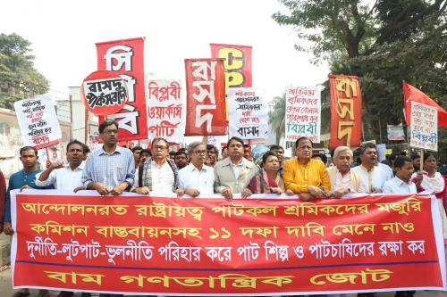 নেতৃবৃন্দ বলেন, পাট শিল্পে ২০১৫ সালে ঘোষিত মজুরি কমিশন এখনও বাস্তবায়িত হয়নি। শ্রমিকদের ১৫ সপ্তাহের মজুরি বকেয়া রয়েছে। অবসরে যাওয়া শ্রমিক এখনো তাদের পিএফ’র টাকা পায়নি। শ্রমিকদের বেলায় সরকার নিষ্ঠুর। পাওনা পরিশোধের টাকা নাই। কিন্তু আমলাদের সুযোগ সুবিধা দ্বিগুণ করে দেয়া হয়েছে। নেতৃবৃন্দ অবিলম্বে শ্রমিকদের পাওনা মজুরি ও পিএফ পরিশোধ করার জন্য সরকারের প্রতি আহŸান জানান। তারা নতুন মেশিন দিয়ে পাটকলসমূহ আধুনিকায়ণের জন্য বাজেটে অর্থ বরাদ্দের দাবি জানান।