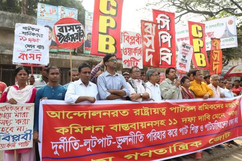 পাটকল শ্রমিকদের ১১ দফা দাবি ও অনশনরত পাটকল শ্রমিক আব্দুস সাত্তার ও সোহরাব হোসেনের মৃত্যুর প্রতিবাদে আজ ১৫ ডিসেম্বর, জাতীয় প্রেসক্লাবের সামনে সমাবেত হয়ে বাম গণতান্ত্রিক জোটের কর্মীবৃন্দ বিক্ষোভ মিছিল নিয়ে মতিঝিলস্থ আদমজি কোর্টের বিজেএমসি কার্যালয়ের সামনে বিক্ষোভ প্রদর্শন করে। জোটের সমন্বয়ক আবদুল্লাহ ক্বাফী রতনের সভাপতিত্বে বিক্ষোভ সমাবেশে বক্তব্য রাখেন সিপিবি’র সাধারণ সম্পাদক মোহাম্মদ শাহ আলম, বাসদ কেন্দ্রীয় কমিটির সদস্য রাজেকুজ্জামান রতন, গণসংহতি আন্দোলনের প্রধান সমন্বয়ক জোনায়েদ সাকী, ইউসিএলবি’র সম্পাদকমণ্ডলীর সদস্য আব্দুস সাত্তার, বিপ্লবী ওয়ার্কার্স পার্টির পলিটব্যুরোর সদস্য আকবর খান, বাসদ (মার্কসবাদী)’র কেন্দ্রীয় কমিটির সদস্য ফখরুদ্দীন কবীর আতিক, গণতান্ত্রিক বিপ্লবী পার্টির শহিদুল ইসলাম সবুজ। বিক্ষোভ সমাবেশে উপস্থিত ছিলেন বিপ্লবী ওয়ার্কার্স পার্টির সাধারণ সম্পাদক সাইফুল হক, সিপিবি’র কোষাধ্যক্ষ মাহবুবুল আলম, বাসদ কেন্দ্রীয় কমিটির সদস্য বজলুর রশীদ ফিরোজ, গণতান্ত্রিক বিপ্লবী পার্টির সাধারণ সম্পাদক মোশরেফা মিশু প্রমুখ। সভা পরিচালনা করেন বাসদ নেতা খালেকুজ্জামান লিপন।
