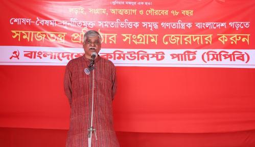 সমাবেশে সিপিবির সাধারণ সম্পাদক আবদুল্লাহ ক্বাফী রতন বলেন, বারবার প্রতারণার শিকার হওয়া বাংলাদেশের সাধারণ মানুষকে লুটেরা পুঁজিবাদী শক্তি, মৌলবাদ ও সাম্রাজ্যবাদের বিরুদ্ধে আপসহীন লড়াই গড়ে তুলতে হবে। শোষণ ও বৈষম্যের বিরুদ্ধে শ্রমজীবী মানুষকে সংগঠিত করে একটি ন্যায়ভিত্তিক সমাজ প্রতিষ্ঠার সংগ্রাম জোরদার করতে হবে। সিপিবি এই কাজটি নিষ্ঠার সঙ্গে অগ্রসর করবে।